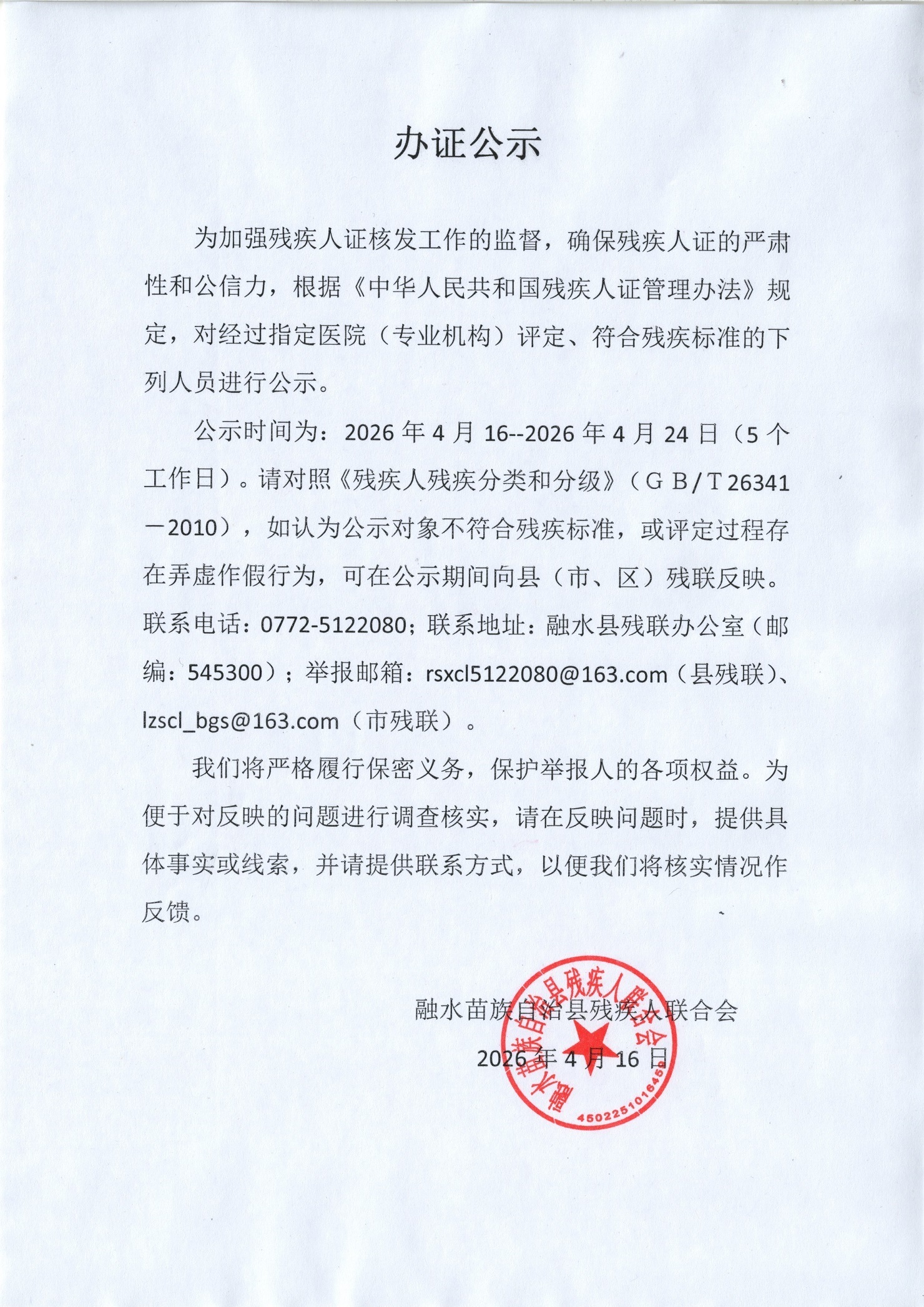 2026年融水县残疾儿童康复救助名单公示2026.3.12