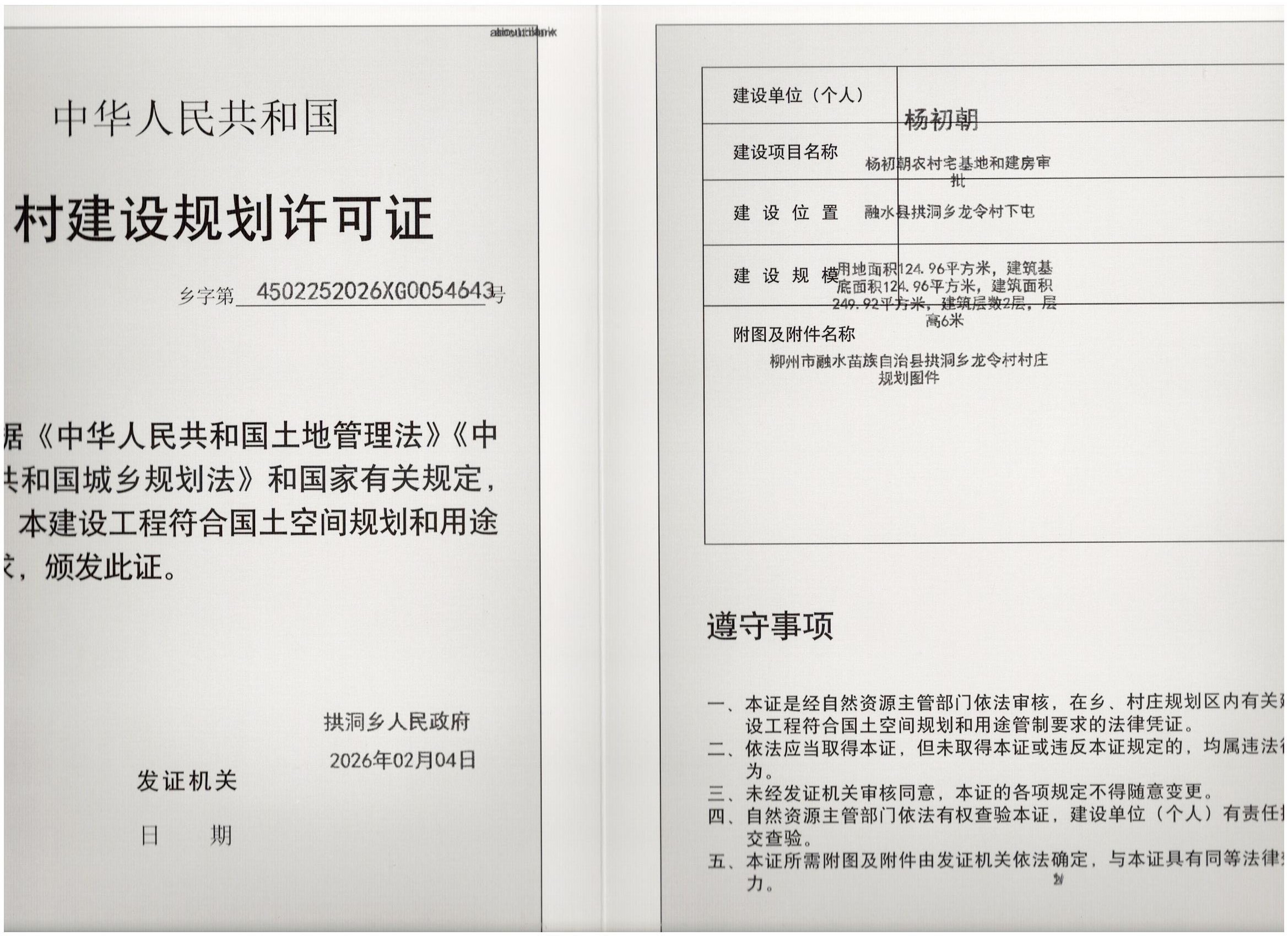 乡村建设规划许可证:乡字第4502252026XG0054643号公示