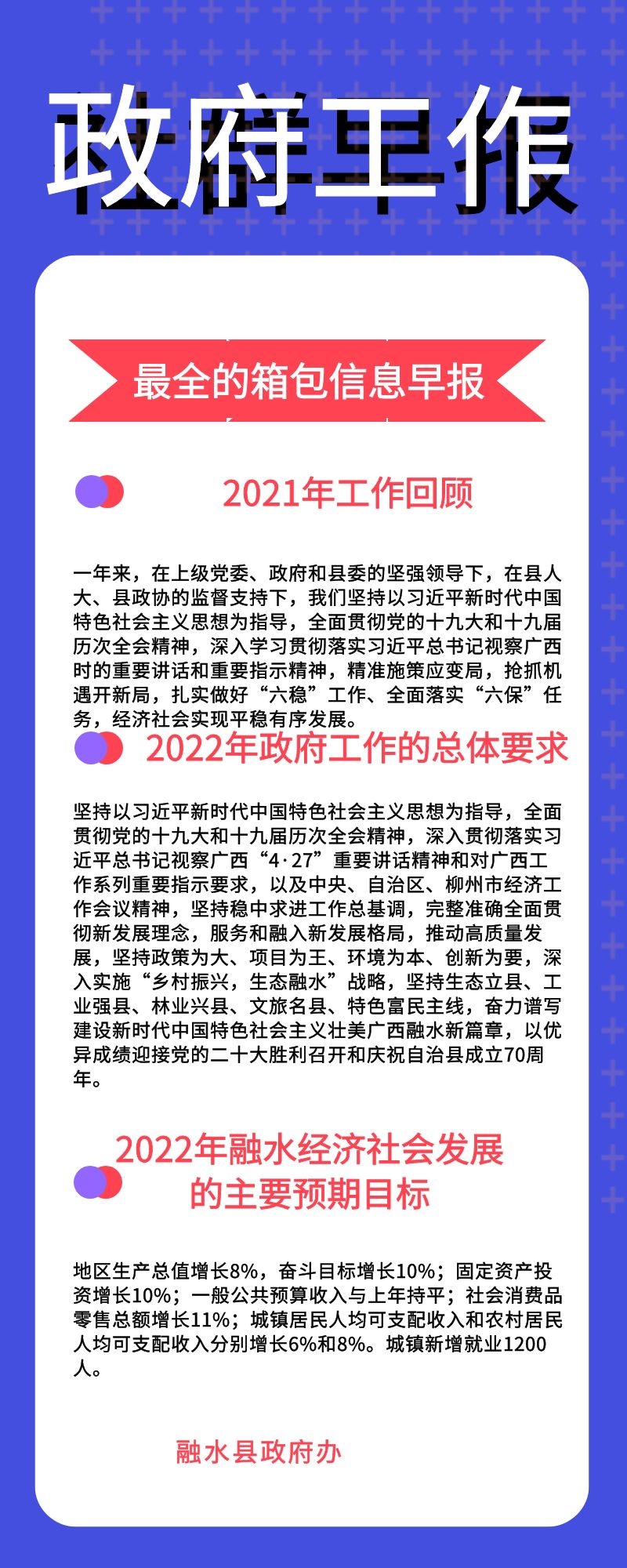 坚持以习近平新时代中国特色社会主义思想为指导,全面贯彻党的十九大和十九届历次全会精神,深入贯彻落实习近平总书记视察广西“4·27”重要讲话精神和对广西工作系列重要指示要求,以及中央、自治区、柳州市经济工作会议精神,坚持稳中求进工作总基调,完整准确全面贯彻新发展理念,服务和融入新发展格局,推动高质量发展,坚持政策为大、项目为王、环境为本、创新为要,深入实施“乡村振兴,生态融水”战略,坚持生态立县、工业强县、林业兴县、文旅名县、特色富民主线,奋力谱写建设新时代中国特色社会主义壮美广西融水新篇章,以优异成绩迎接党的二十大胜利召开和庆祝自治县成立70周年。