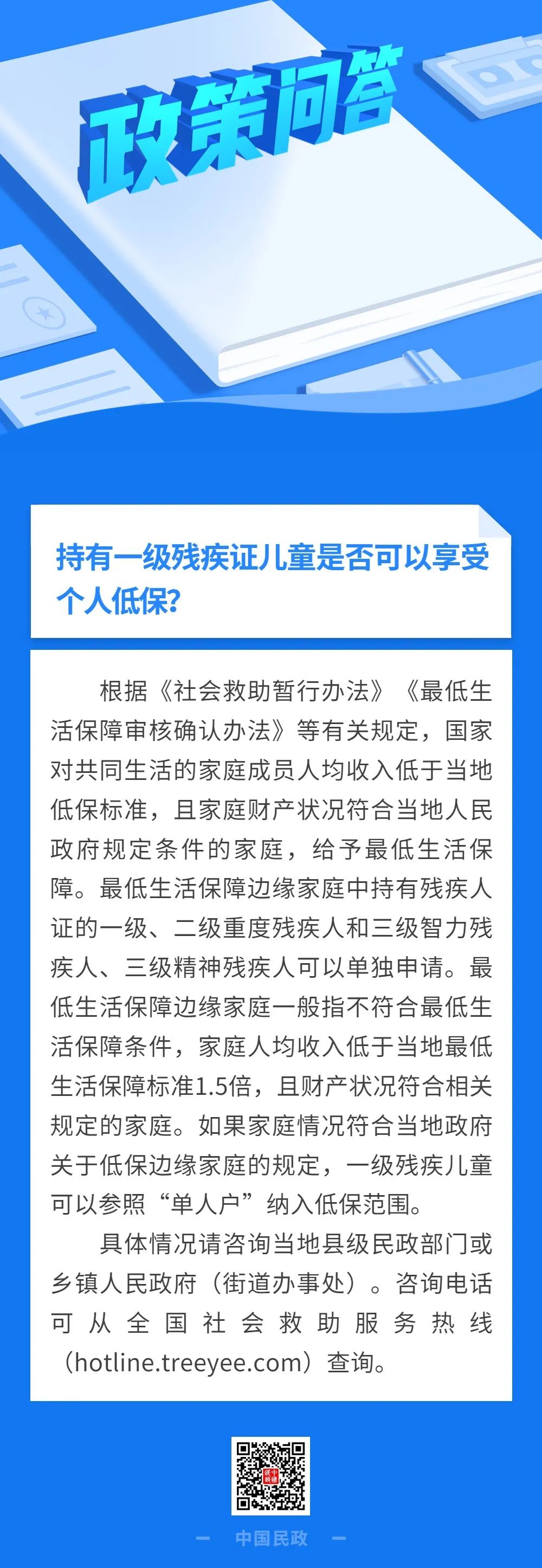 政策问答|持有一级残疾证儿童是否可以享受个人低保?