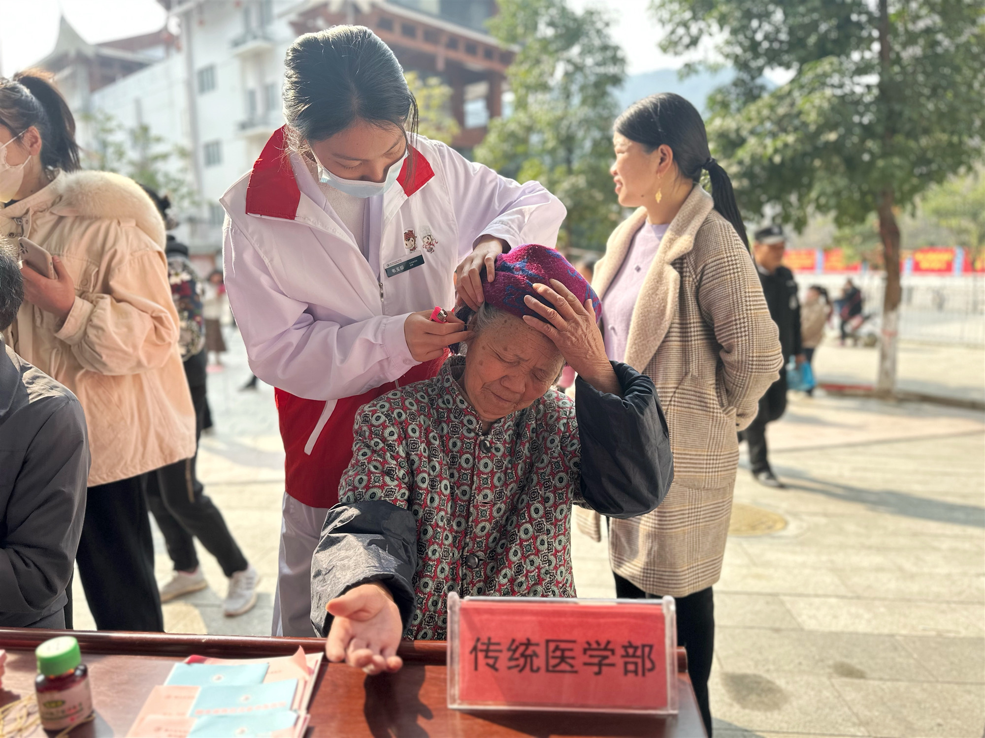 自治县中医医院党总支、团支部带领医院内科三病区、内科四病区、传统医学部的志愿者通过现场义诊的方式为广大群众量血压、测血糖、开展中医外治等健康服务。对老弱病残、行动不便的老人,志愿者们用通俗易懂的语言主动上前问诊,普及医疗卫生知识,讲解高血压、糖尿病等常见疾病的医疗保健常识和健康膳食、合理运动等科学生活常识,引导人们在日常生活中科学饮食、健康生活。