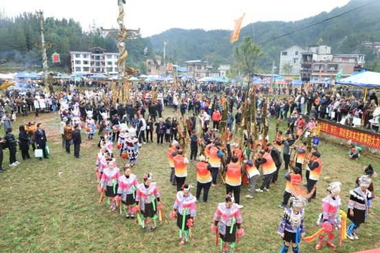 在安太乡元宝村整朵苗寨,各个踩堂队伍围着芦笙柱转圈,华丽的服饰与悦耳的芦笙曲交织,吸引了众多游客驻足拍照。