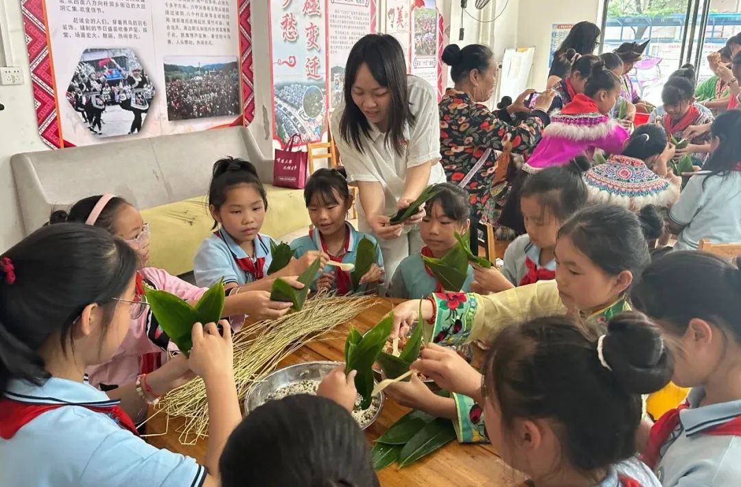 融水镇苗家小镇社区举办 “童心护安全” 游园活动。防溺水宣传片后,“如何正确求救” 等问题引发孩子们踊跃抢答。在端午文化体验环节,孩子们在志愿者指导下动手包粽子,粽叶翻飞间感受习俗魅力。活动还设置民族团结手工DIY环节,孩子们在画卷中添加壮族绣球、苗族银饰等元素,“民族一家亲” 的美好愿景在笔下绽放。