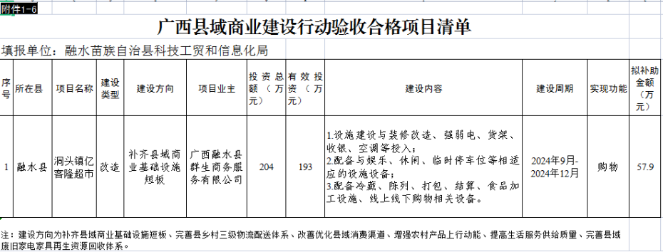 根据自治区商务厅、自治区财政厅、自治区乡村振兴局关于印发《广西县域商业建设行动试点县及项目管理细则》《广西县域商业建设行动资金管理细则的通知》(桂商建发〔2025〕53号)文件精神,2025年12月17日,融水县科技工贸和信息化局、财政局、乡村振兴局、农业农村局、市场监督管理局等相关部门对融水县洞头镇亿客隆超市项目进行验收,初步验收合格,按程序进行公示,公示期5天,具体情况如下: