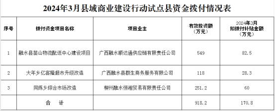 根据自治区商务厅、自治区财政厅、自治区乡村振兴局关于印发《广西县域商业建设行动试点县及项目管理细则(试行)》《广西县域商业建设行动资金管理细则(试行)》的通知(桂商建发〔2022〕48号)文件要求,经相关部门共同验收后,征求县人民政府同意,对我县县域商业体系建设3个项目进行资金拨付。现将名单公布如下: