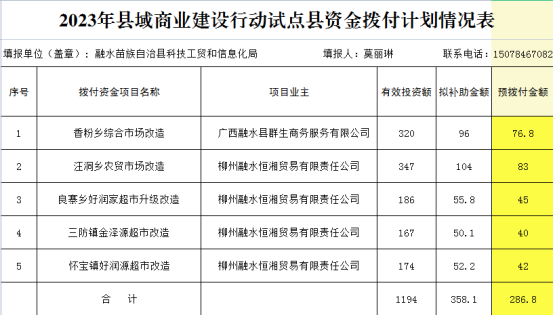 根据自治区商务厅、自治区财政厅、自治区乡村振兴局关于印发《广西县域商业建设行动试点县及项目管理细则(试行)》《广西县域商业建设行动资金管理细则(试行)》的通知(桂商建发〔2022〕48号)文件要求,经相关部门共同验收后,征求县人民政府同意,对我县县域商业体系建设5个项目进行资金拨付。现将名单公布如下: