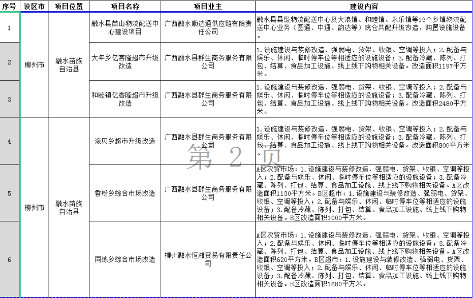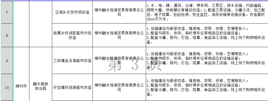 根据《自治区商务厅 自治区财政厅 自治区农业农村厅关于调整2023年广西县域商业建设行动试点县储备项目的通知桂商建发〔2024〕44号》文,将融水县原9个储备项目调整后变更为10个,具体名单公布如下: