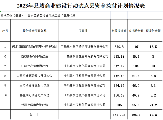 根据自治区商务厅、自治区财政厅、自治区乡村振兴局关于印发《广西县域商业建设行动试点县及项目管理细则(试行)》《广西县域商业建设行动资金管理细则(试行)》的通知(桂商建发〔2022〕48号)文件要求,因苗山物流配送中心项目建设方案有新调整,有效投资和拟补资金由原来的549万、164.7万调整为356.8万和107万元,项目已通过验收。目前该项目有70.8万在我局监管账户,现项目业主将70.8万资金已退回国库,根据资金管理文件要求进行重新分配,具体分配名单公布如下: