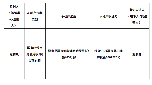 根据《不动产登记暂行条例实施细则》第十四条的规定,经初步查验,不动产登记机构拟对下列不动产权利办理不动产继承登记。根据《不动产登记暂行条例实施细则》第十七条的规定,现予公告。如 有异议,请自本公告之日起十五个工作日内,将异议书面材料送达不动产登记机构。逾期无人提出异议 或者异议不成立的,不动产登记机构将予以登记。