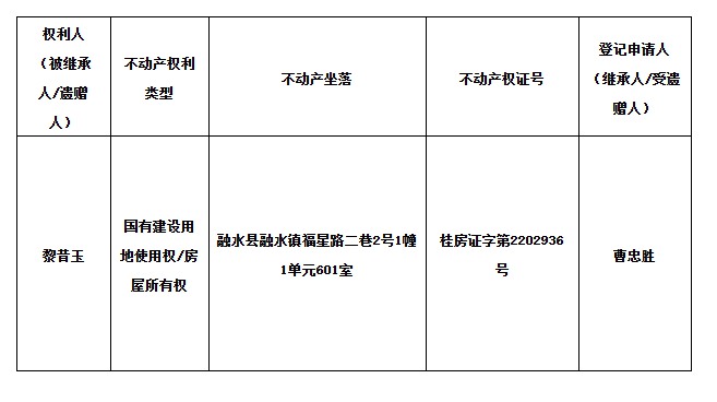 异议书面材料送达地址:融水县融水镇水东新区民族大道203号振城大厦二楼32、33不动产继承窗口 。