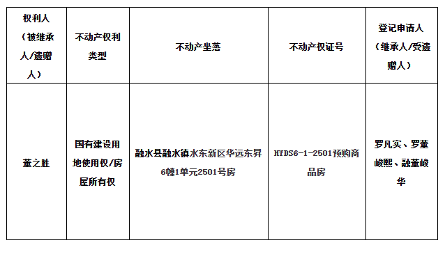 根据《不动产登记暂行条例实施细则》第十四条的规定,经初步查验,不动产登记机构拟对下列不动产权利办理不动产继承登记。根据《不动产登记暂行条例实施细则》第十七条的规定,现予公告。如 有异议,请自本公告之日起十五个工作日内,将异议书面材料送达不动产登记机构。逾期无人提出异议 或者异议不成立的,不动产登记机构将予以登记。