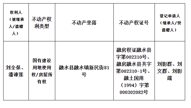 根据《不动产登记暂行条例实施细则》第十四条的规定,经初步查验,不动产登记机构拟对下列不动产权利办理不动产继承登记。根据《不动产登记暂行条例实施细则》第十七条的规定,现予公告。如 有异议,请自本公告之日起十五个工作日内,将异议书面材料送达不动产登记机构。逾期无人提出异议 或者异议不成立的,不动产登记机构将予以登记。