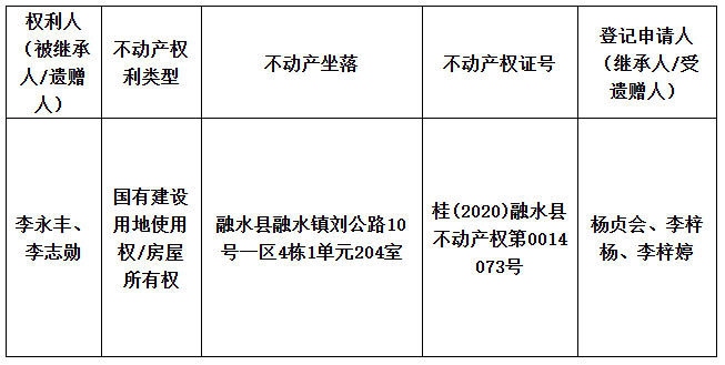 根据《不动产登记暂行条例实施细则》第十四条的规定,经初步查验,不动产登记机构拟对下列不动产权利办理不动产继承登记。根据《不动产登记暂行条例实施细则》第十七条的规定,现予公告。如 有异议,请自本公告之日起十五个工作日内,将异议书面材料送达不动产登记机构。逾期无人提出异议 或者异议不成立的,不动产登记机构将予以登记。