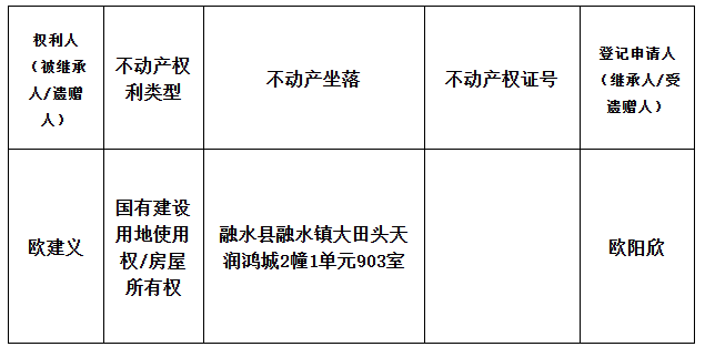 根据《不动产登记暂行条例实施细则》第十四条的规定,经初步查验,不动产登记机构拟对下列不动产权利办理不动产继承登记。根据《不动产登记暂行条例实施细则》第十七条的规定,现予公告。如 有异议,请自本公告之日起十五个工作日内,将异议书面材料送达不动产登记机构。逾期无人提出异议 或者异议不成立的,不动产登记机构将予以登记。