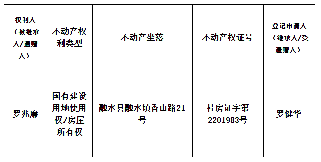 根据《不动产登记暂行条例实施细则》第十四条的规定,经初步查验,不动产登记机构拟对下列不动产权利办理不动产继承登记。根据《不动产登记暂行条例实施细则》第十七条的规定,现予公告。如 有异议,请自本公告之日起十五个工作日内,将异议书面材料送达不动产登记机构。逾期无人提出异议 或者异议不成立的,不动产登记机构将予以登记。