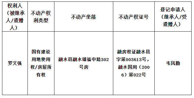 根据《不动产登记暂行条例实施细则》第十四条的规定,经初步查验,不动产登记机构拟对下列不动产权利办理不动产继承登记。根据《不动产登记暂行条例实施细则》第十七条的规定,现予公告。如 有异议,请自本公告之日起十五个工作日内,将异议书面材料送达不动产登记机构。逾期无人提出异议 或者异议不成立的,不动产登记机构将予以登记。