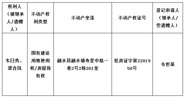 异议书面材料送达地址:融水县融水镇水东新区民族大道203号振城大厦二楼32、33不动产继承窗口 。