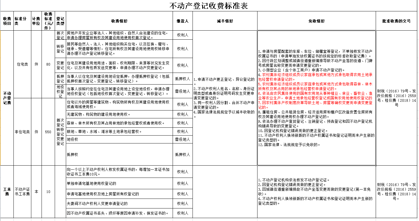 说明: 6、用于提供社区养老、托育、家政服务的房产、土地,免征不动产登记费。 7、属易地扶贫搬迁项目的免收登记费。 | ||||