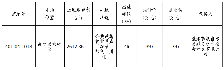 融水苗族自治县土地交易储备中心根据融水苗族自治县自然资源和规划局国有建设用地使用权挂牌出让公告(融水告字〔2026〕1号)要求,依照挂牌出让国有建设用地使用权规定程序,于2026年3月31日在广西壮族自治区公共资源交易平台系统(柳州)交易结束,现将竞价交易结果公示如下: