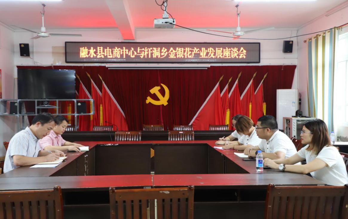 融水苗族自治县电商公共服务中心与杆洞乡唐书记、石宣委开展金银花产业发展座谈会