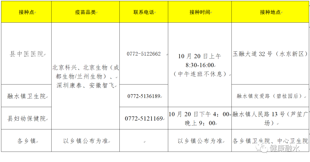10月20日(星期三),我县继续接种新冠病毒疫苗,安排如下:1.县中医医院接种点、融水镇卫生院接种点从上午8:30-16:00(中午连班不休息);2.县妇幼保健院接种点下午4:00-晚上9:00;3.水东广场大型接种点安排休息;4.各乡镇疫苗到位,接种加强第三针的群众,请咨询当地卫生院。