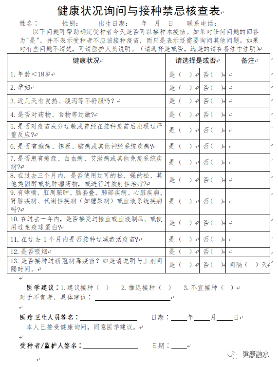 请大家认真阅读健康咨询询问表,扫描登记完善个人信息,生成预登记码,持个人预登记码和身份证到现场接种。