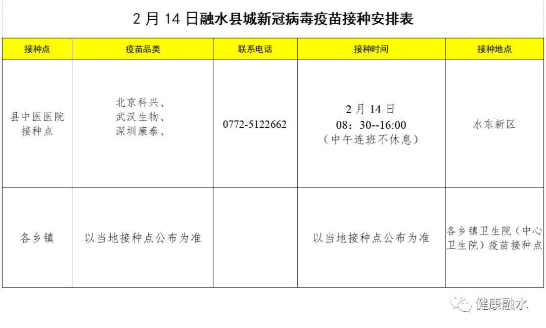 2月14日(星期一),县城疫苗接种安排如下:1.县中医医院接种点从8:30--16:00(中午连班不休息);2.各乡镇群众有接种需要的,请咨询当卫生院。