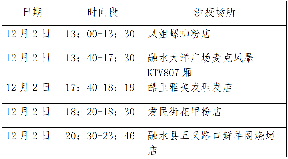 2022年12月2日,融水苗族自治县疾控中心报告1名返乡人员新冠病毒核酸检测呈阳性。现将涉疫人员所在相关时间段的风险点通告如下: