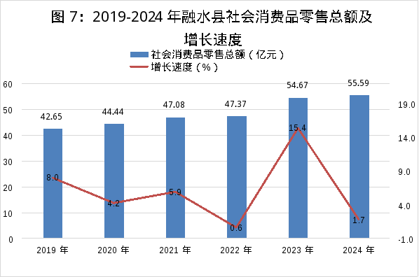 全县实现社会消费品零售总额55.59亿元,比上年增长1.7%。按销售单位所在地分,城镇零售额50.17亿元,增长2.5%,乡村零售额5.42亿元,下降5.2%;按消费形态分,餐饮收入10.28亿元,下降11.4%,商品零售45.31亿元,增长5.2%。