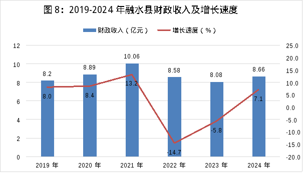 财政收入8.66亿元,同比增长7.1%。其中:公共财政预算收入5.54亿元,增长7.4%。全县财政公共预算支出40.81亿元,比上年增长0.3%。