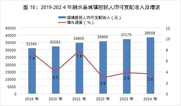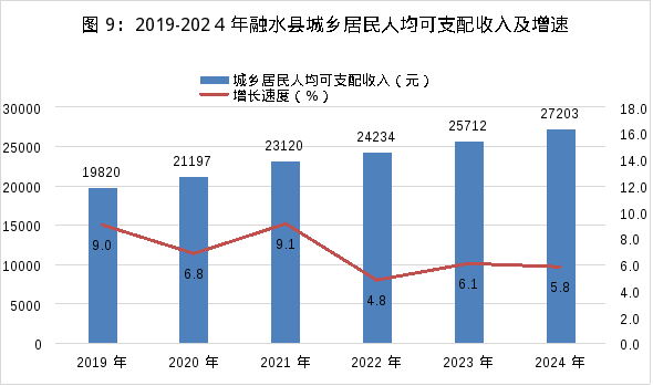 城乡居民人均可支配收入27203元,比上年增加1491元,增长5.8%。其中,城镇居民人均可支配收入38508元,比上年增加1338元,增长3.6%;农村居民人均可支配收入20508元,比上年增加1413元,增长7.4%。