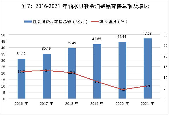 全县社会消费品零售总额47.08亿元,比上年增长5.9%。按销售单位所在地分,城镇消费品零售额29.29亿元,增长8.9%;乡村消费品零售额17.79亿元,增长1.4%。按消费形态分,餐饮收入5.96亿元,增长33.2%;商品零售41.12亿元,增长2.9%。