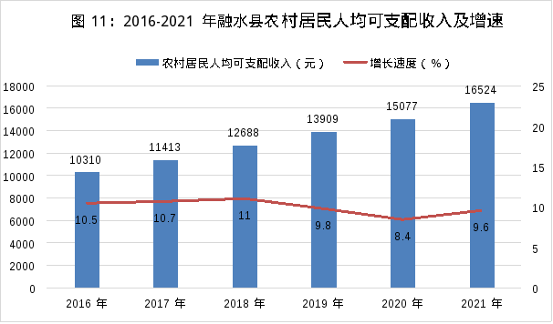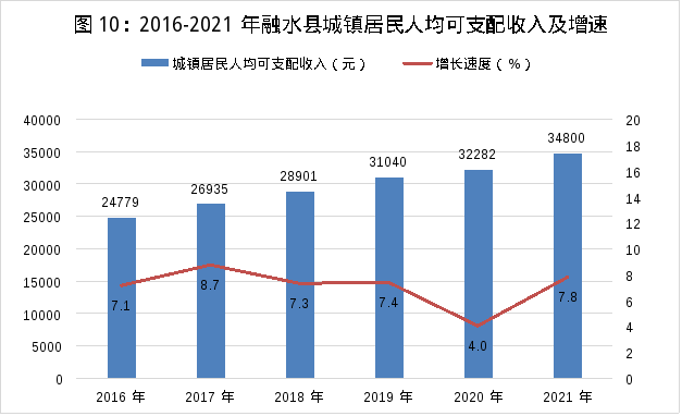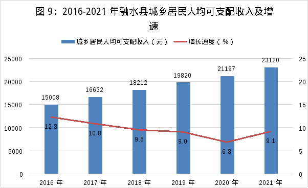 城乡居民人均可支配收入23120元,比上年增加1923元,增长9.1%。其中,城镇居民人均可支配收入34800元,比上年增加2518元,增长7.8%;农村居民人均可支配收入16524元,比上年增加1447元,增长9.6%。