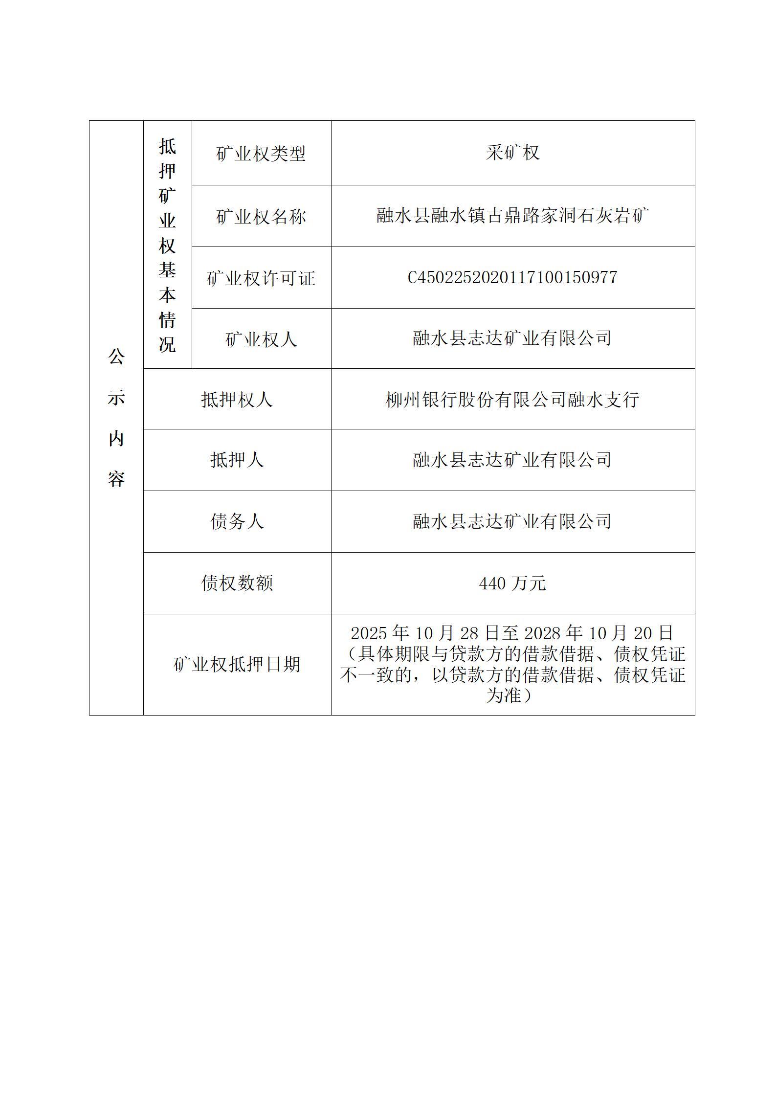 融水县融水镇古鼎路家洞石灰岩矿矿业权抵押信息公示