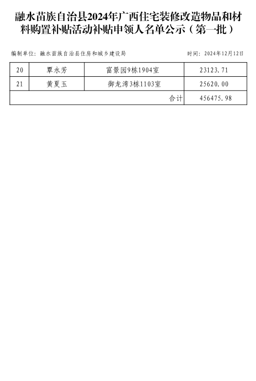 融水苗族自治县2024年广西住宅装修改造物品和材料购置补贴活动补贴申领人名单公示(第一批)
