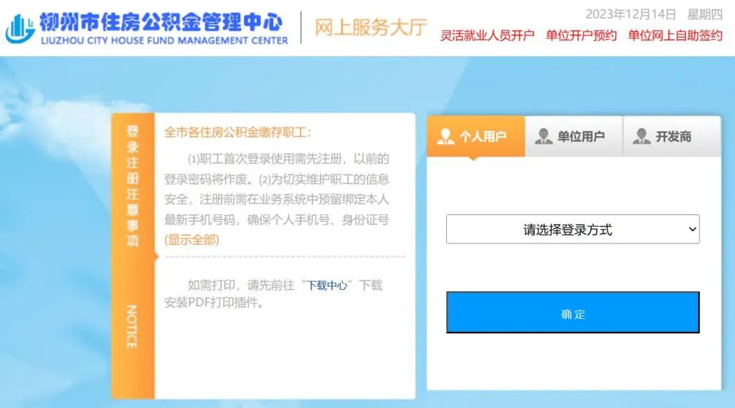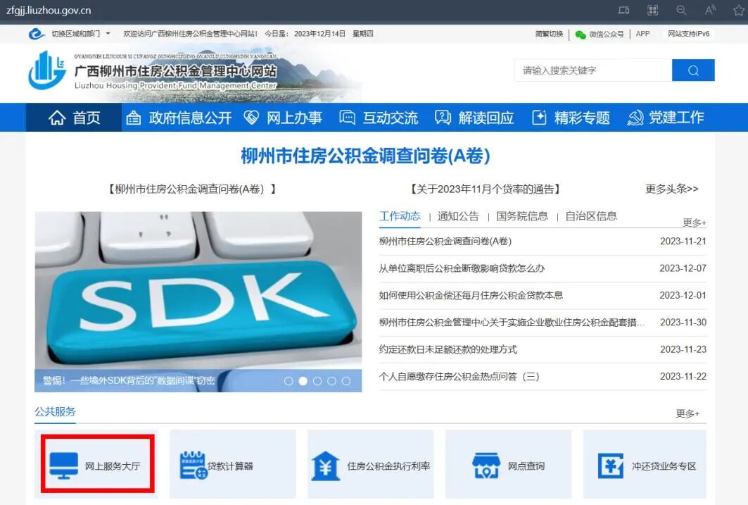 第一步:进入我中心官网首页 http://zfgjj.liuzhou.gov.cn/ ,点击“公共服务”下的“网上服务大厅”