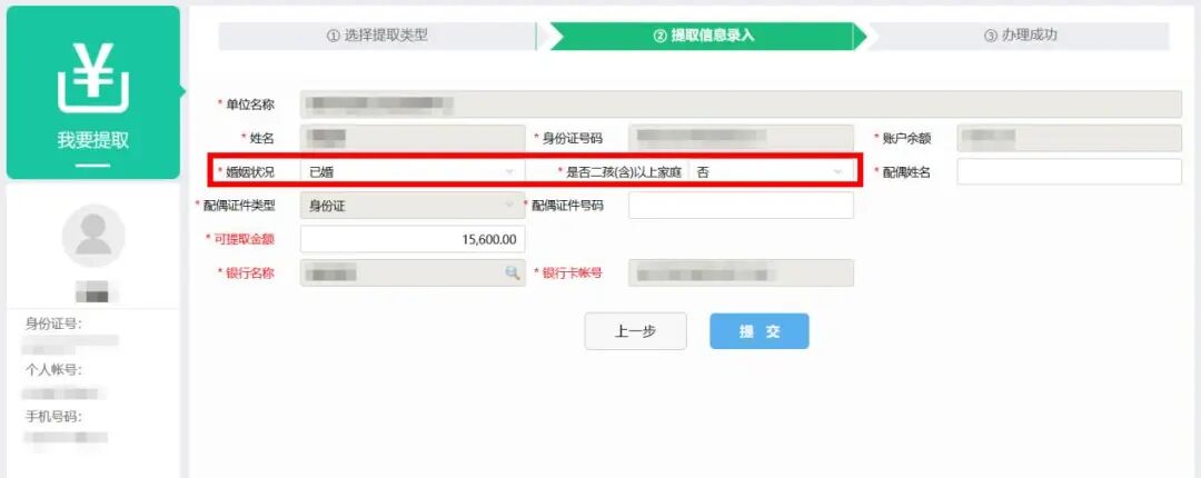 第六步:如实选择“婚姻状况”“是否二孩(含)以上家庭”,并根据提示填写信息,确认提取金额、收款银行卡等信息,确认无误后点击“提交”,提示办理成功后等待到账即可