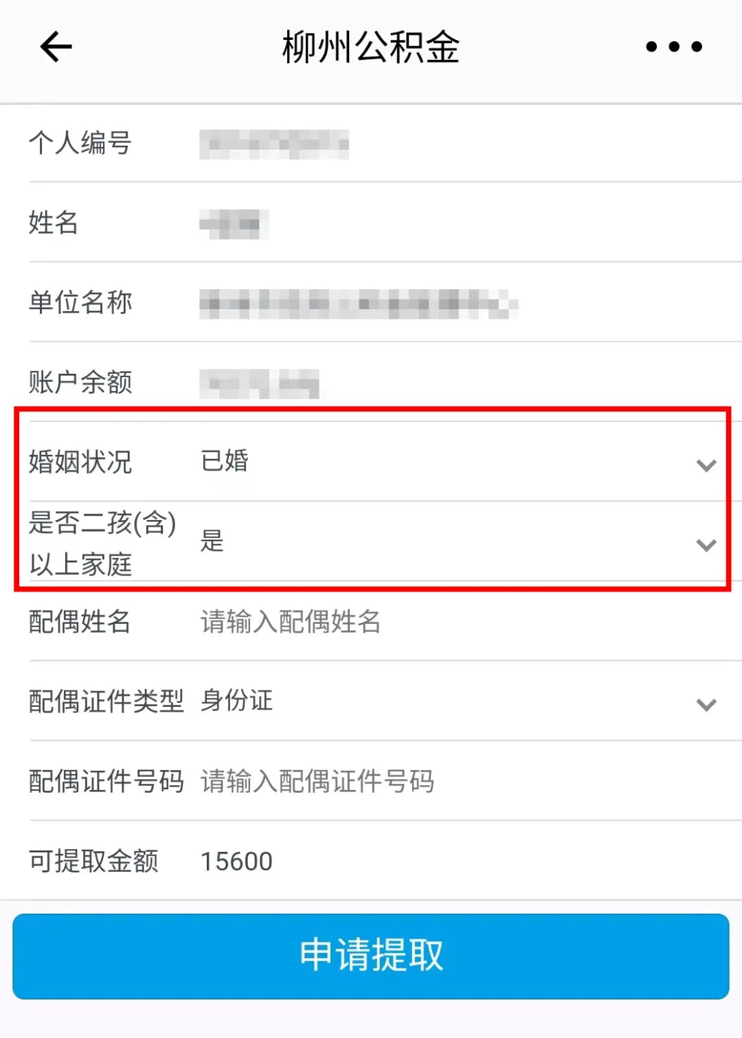 第八步:如实选择“婚姻状况”“是否二孩(含)以上家庭”,并根据提示填写信息,确认无误后点击“申请提取”,提示办理成功后等待到账即可
