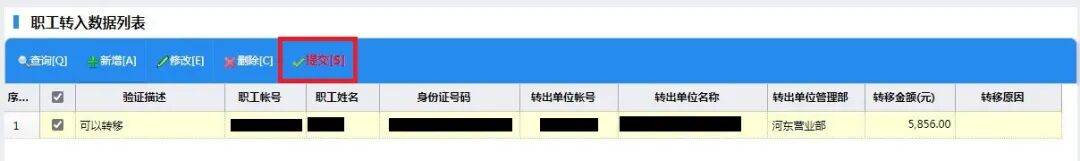 第四步:在“职工转入数据列表”中勾选需要转移的数据条目,点击“提交”,单位操作部分到此结束,如需查询或撤销未办结的转移,可返回此界面进行操作。