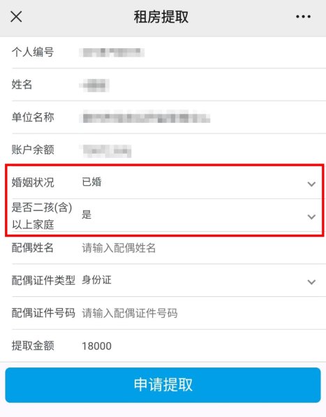 第八步:如实选择“婚姻状况”“是否二孩(含)以上家庭”,并根据提示填写信息,确认无误后点击“申请提取”,提示办理成功后等待到账即可