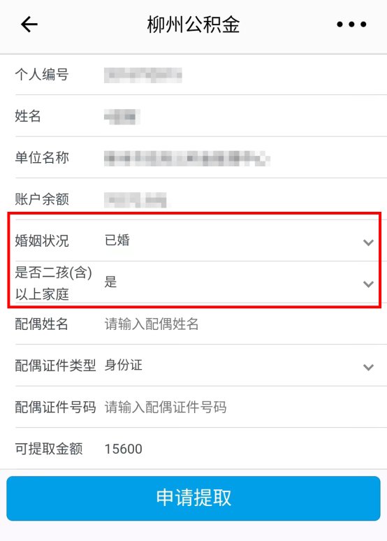 第九步:如实选择“婚姻状况”“是否二孩(含)以上家庭”,并根据提示填写信息,确认无误后点击“申请提取”,提示办理成功后等待到账即可
