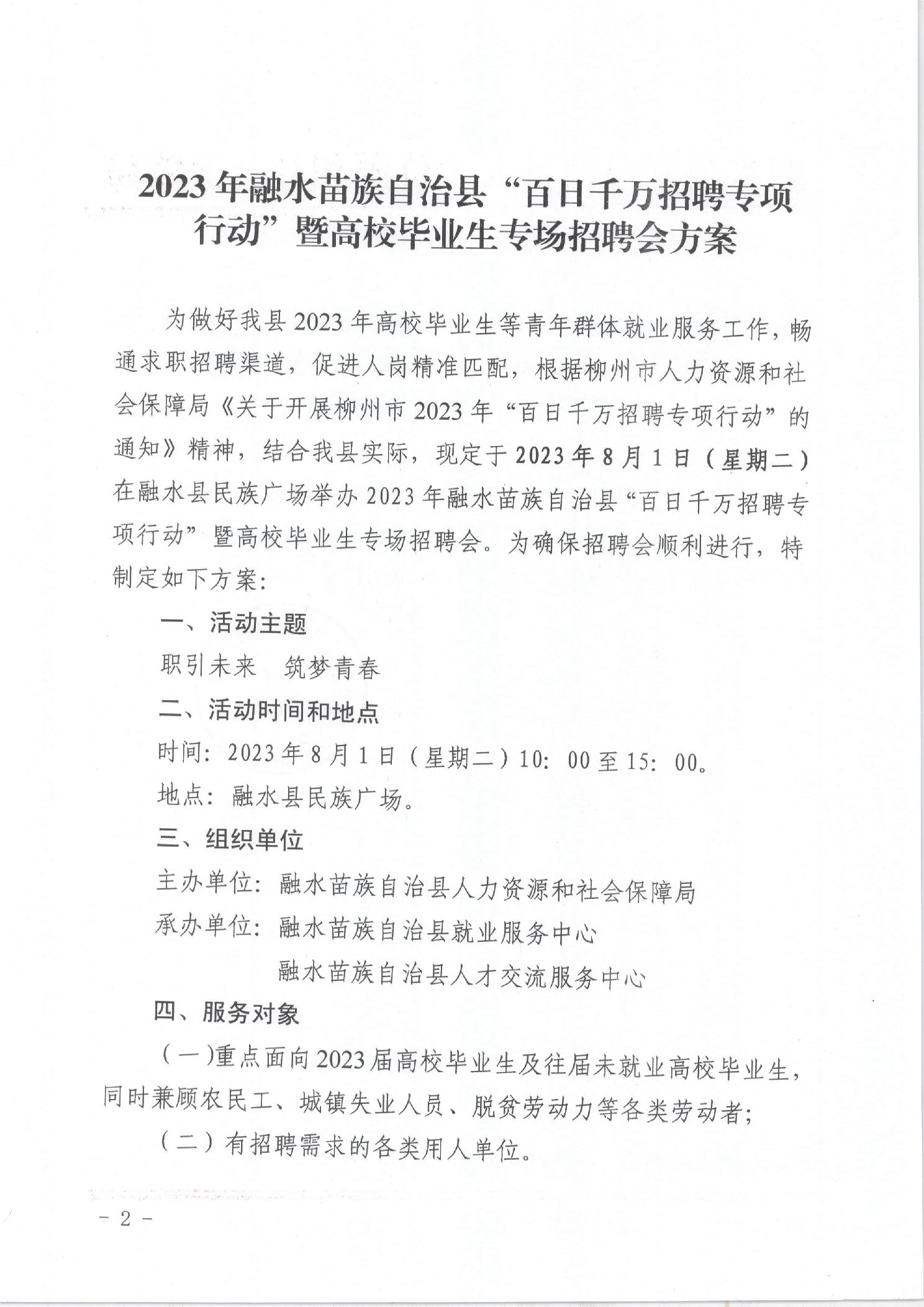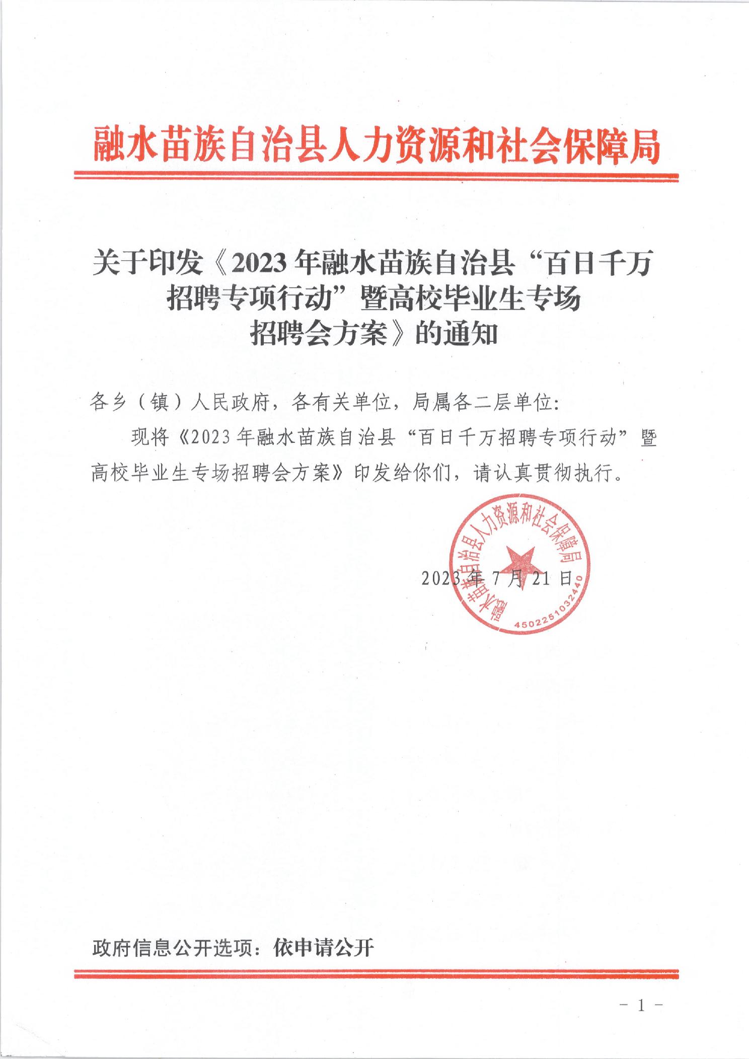 关于印发《2023年融水苗族自治县“百日千万招聘专项行动”暨高校毕业生专场招聘会方案》的通知