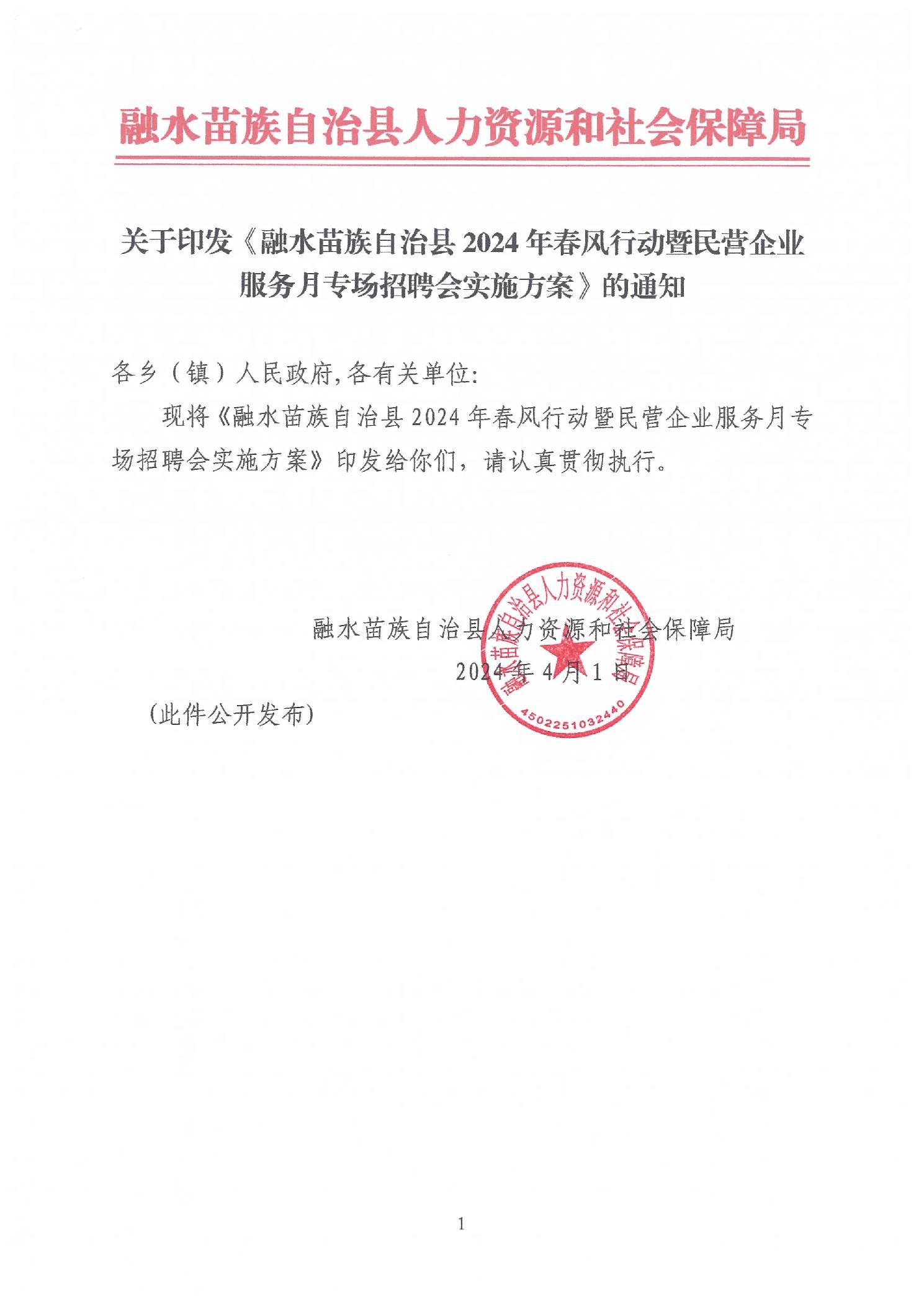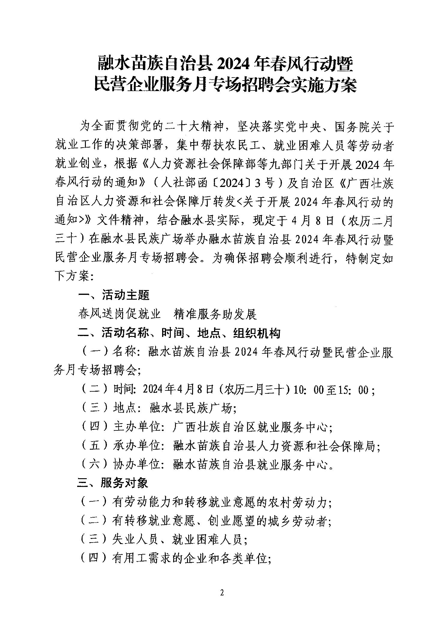 关于印发《融水苗族自治县2024年春风行动暨民营企业服务月专场招聘会实施方案》的通知