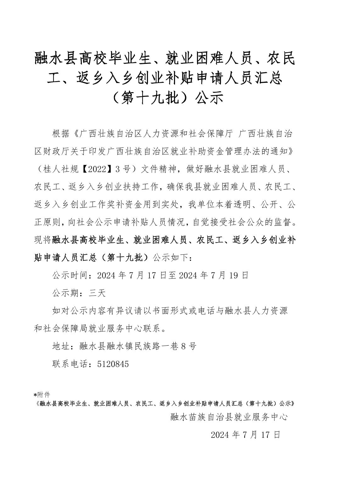 融水县高校毕业生、就业困难人员、农民工、返乡入乡创业补贴申请人员汇总(第十九批)公示