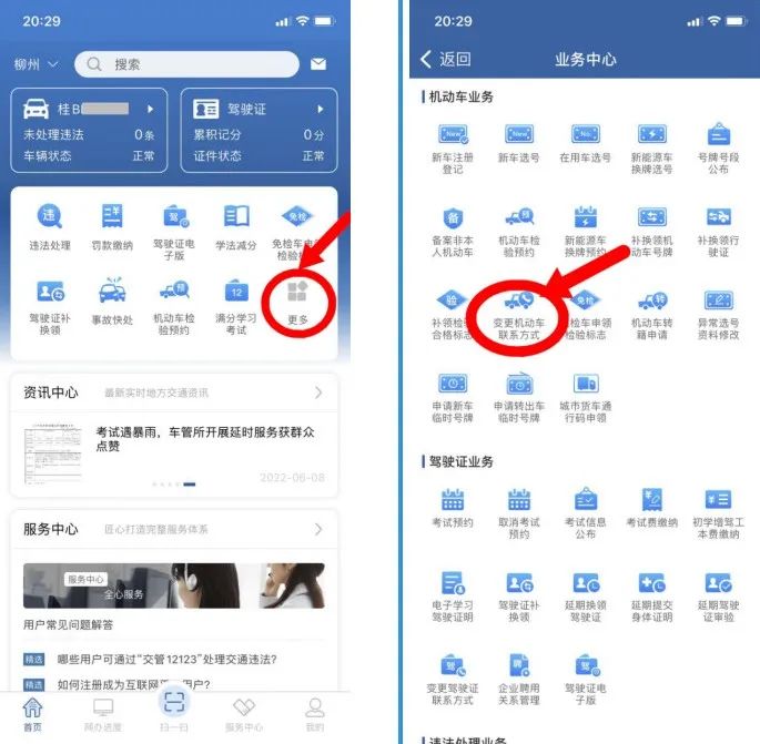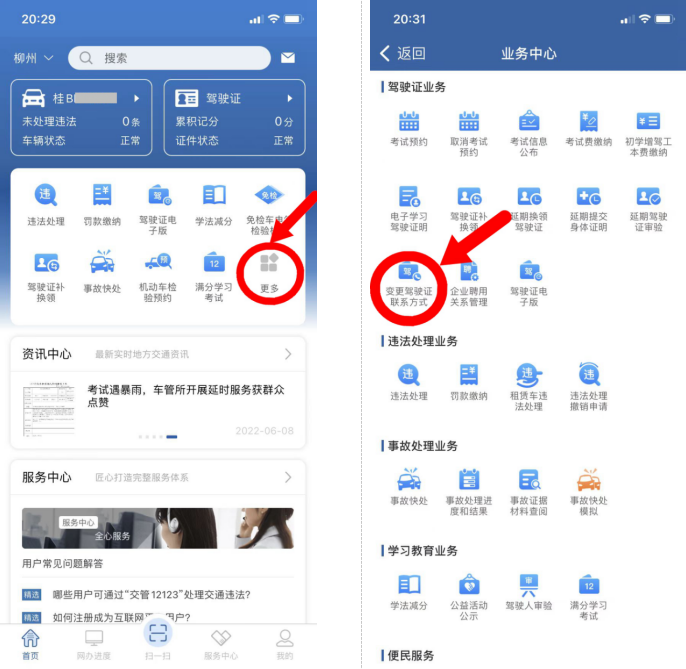 1、登录“交管12123”APP,在首页,点击【更多】→在【业务中心】页面点击【变更驾驶证联系方式】,进入变更联系方式流程;