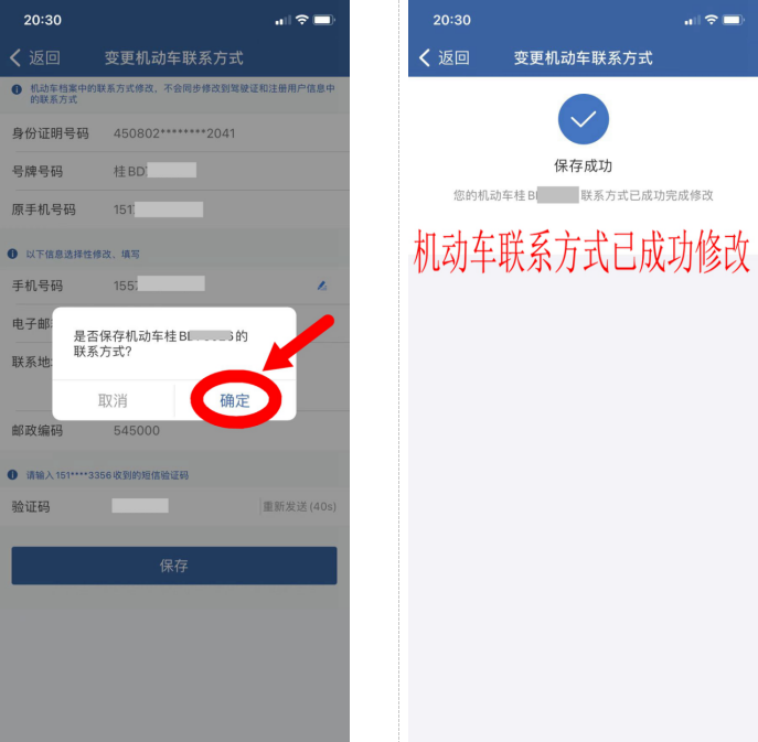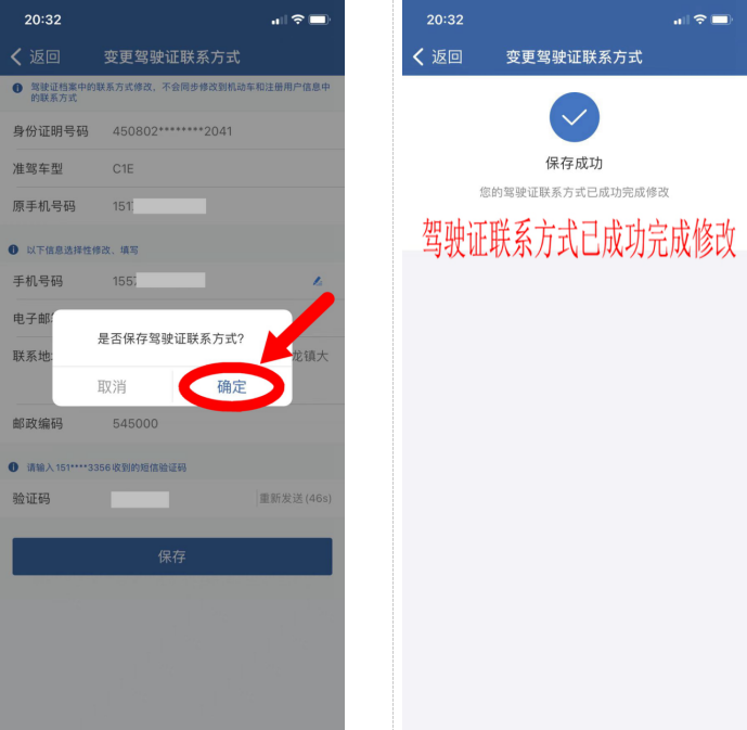 3、进入变更驾驶证联系方式页面,点击红框处填写修改新的手机号码,填入新手机号码,获取验证码→获取原绑定手机号验证码,点击【保存】→保存驾驶证联系方式,点击【确定】,驾驶证联系方式成功完成修改。