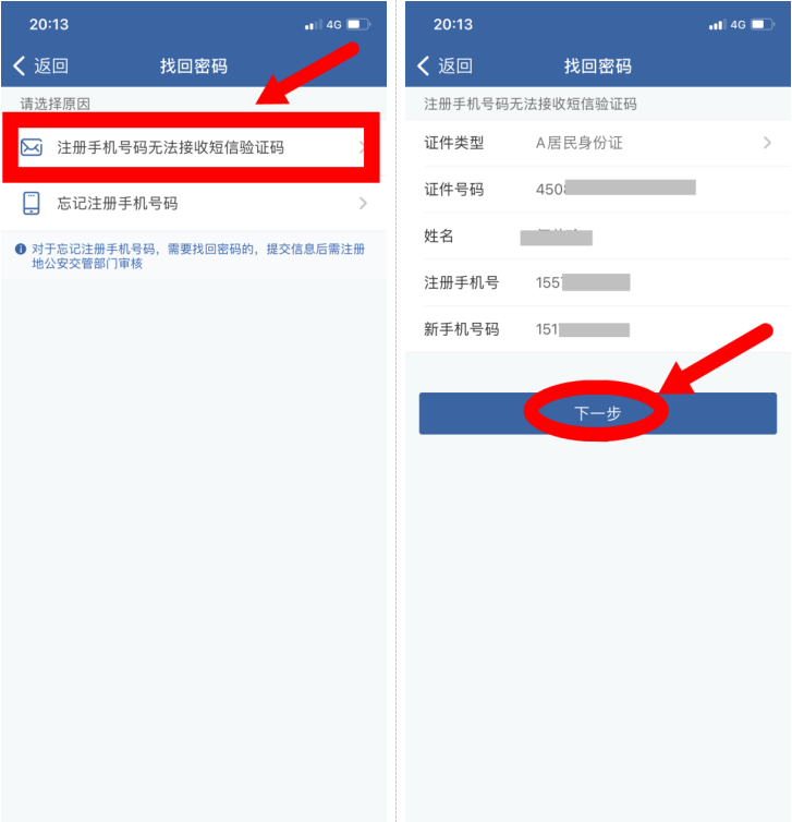 2、请选择原因:注册手机号码无法接收短信验证码或忘记注册手机号码,以选择【注册手机号码无法接收短信验证码】为例,填写证件号码、姓名、注册手机号、新手机号码等信息,点击“下一步”;