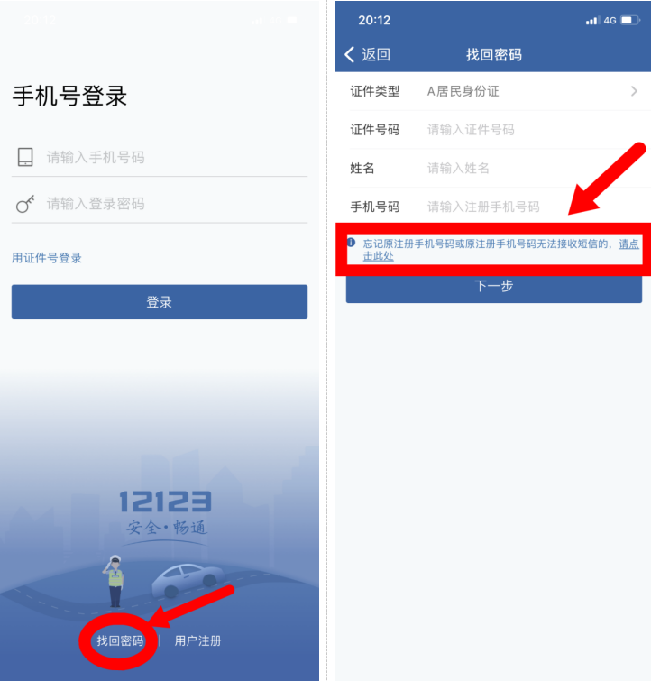 在“交管12123”手机APP上变更手机号码需要确保原手机号码能够收到验证码,方可办理变更联系方式。 如果忘记原手机号码或原手机号码无法收到短信验证码的话,可按以下步骤办理。 1、在登录“交管12123”手机APP首页,点击【找回密码】,点击【忘记原注册手机号码或原注册手机号码无法收短信】;