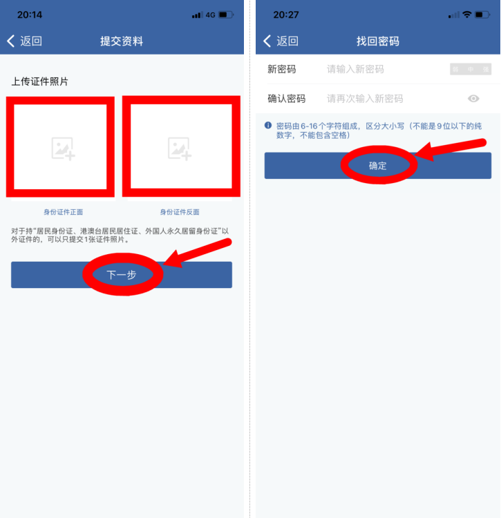 4、上传证件照片,身份证件正面和反面,点击“下一步”→输入新登录密码,确认密码,点击【确定】→提交成功。(您已成功提交资料,请耐心等待结果,审核结果将以短线告知)