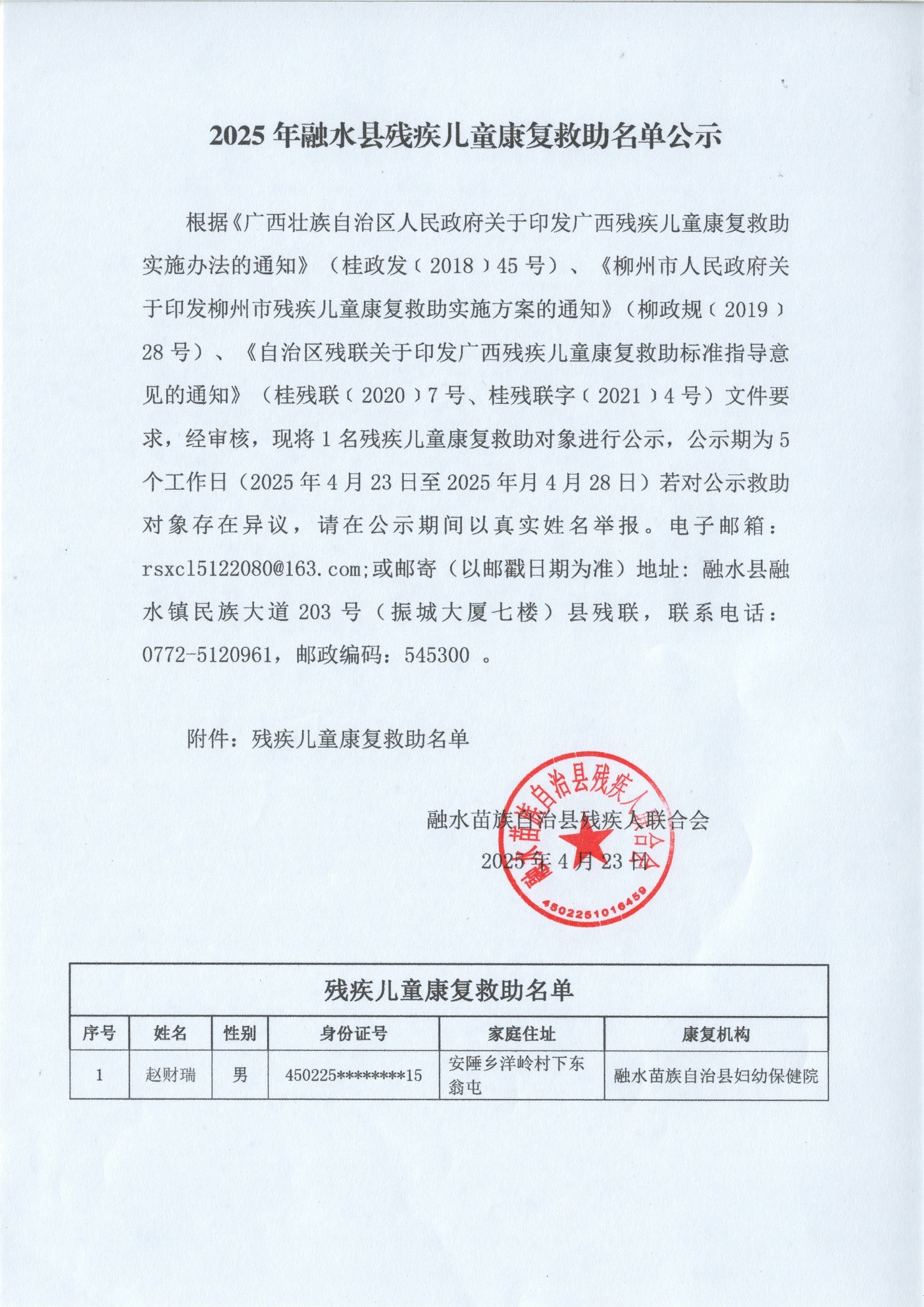 2025年融水县残疾儿童康复救助名单公示2025.12.8